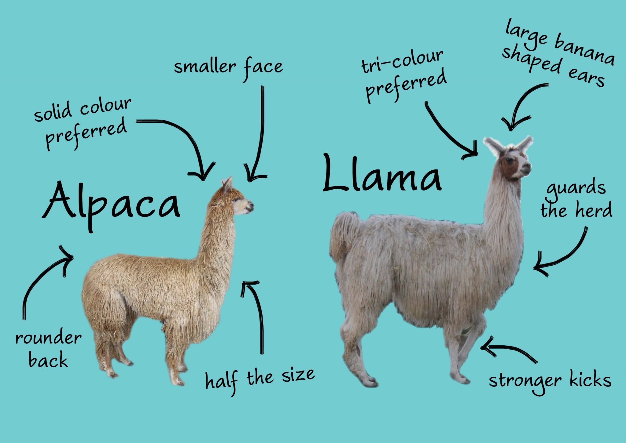 There are two different types of alpacas (this is true for llamas as well). Huacaya alpacas are big and fluffy with cloud-like fiber. Suri alpacas (shown in the Alpaca vs Llama diagram above) have long, curly locks that hang down from their bodies. Suris are rarer, which often makes them more expensive. Both types of alpaca’s vary in the colour of their fiber. An alpaca can be white, fawn, brown, black, grey, and everything in between.